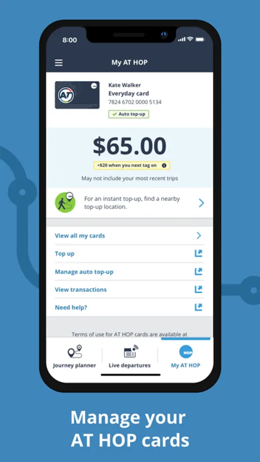 Manage your AT HOP balance - Don’t wait till you get home, check your balance on the go, find nearby top-up locations, and easily top-up.