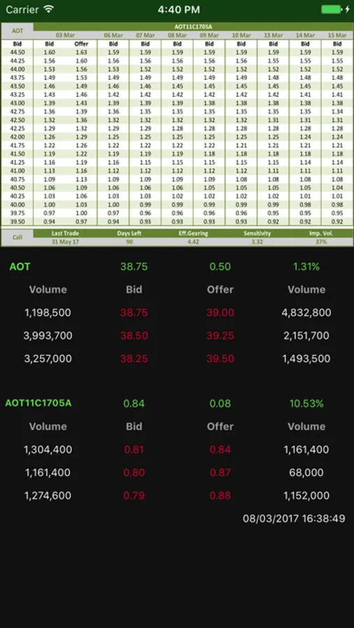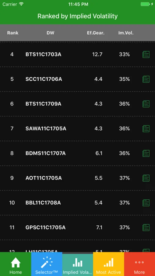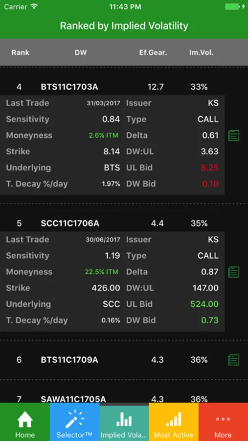 • แสดงข้อมูลเฉพาะของ DW แต่ละรุ่น เช่น วันหมดอายุ, ราคาใช้สิทธิ, ค่าการคำนวณต่างๆ เช่น Implied Volatility, Effective Gearing, Sensitivity และอื่นๆ เพื่อประกอบการตัดสินใจลงทุนใน DW