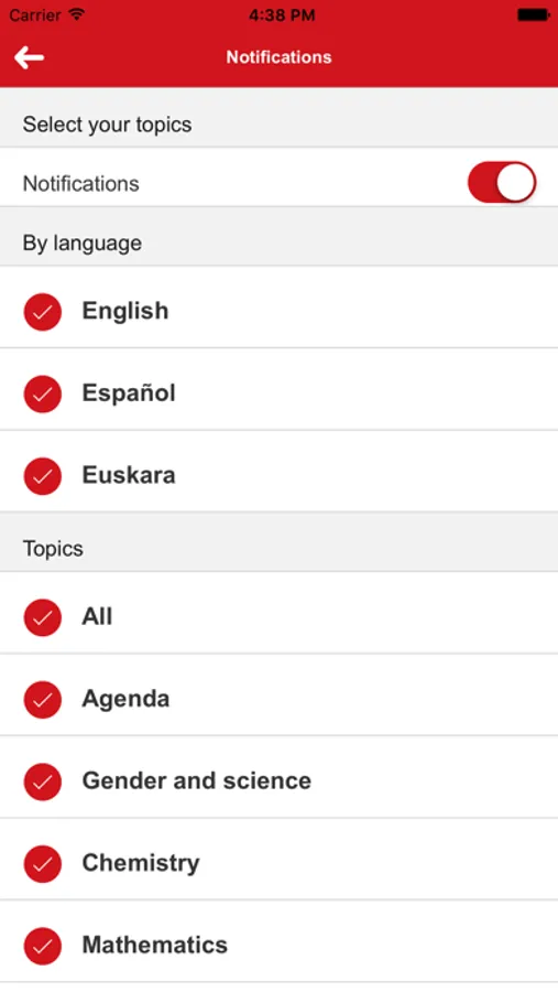 Aplikazioaren interfazea eleanitza da, baina euskara aukeratzen baduzu, seguruenik eleaniztuna zarenez, gaztelaniazko eta ingelesezko oharrak jasotzea ere erabaki dezakezu. Era berean, notifikazioen esparrua zure gustuko gai jakin batzuetara murriztu dezakezu. Notifikazioen zure menua apailatu, eta oharrak jasoko dituzu aurrerantzean, berritasunak izana ahala.