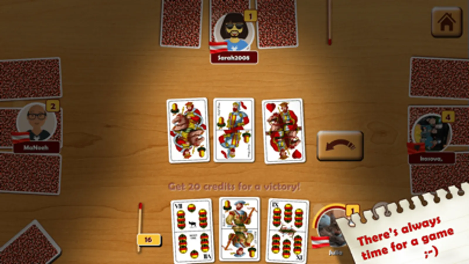 Game rules: There are between two and four players and 32 cards. Every player always has a hand of three cards and one to three lives indicated by matchsticks. Three more cards are placed face-up in the center. Whoever first reaches 31 points wins the round. If no-one reaches 31 points, the player with the lowest point score loses a life.