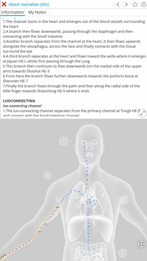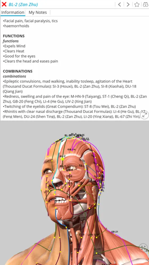 Each acupuncture point, meridian (and anatomical model) contain full textual descriptions, which can