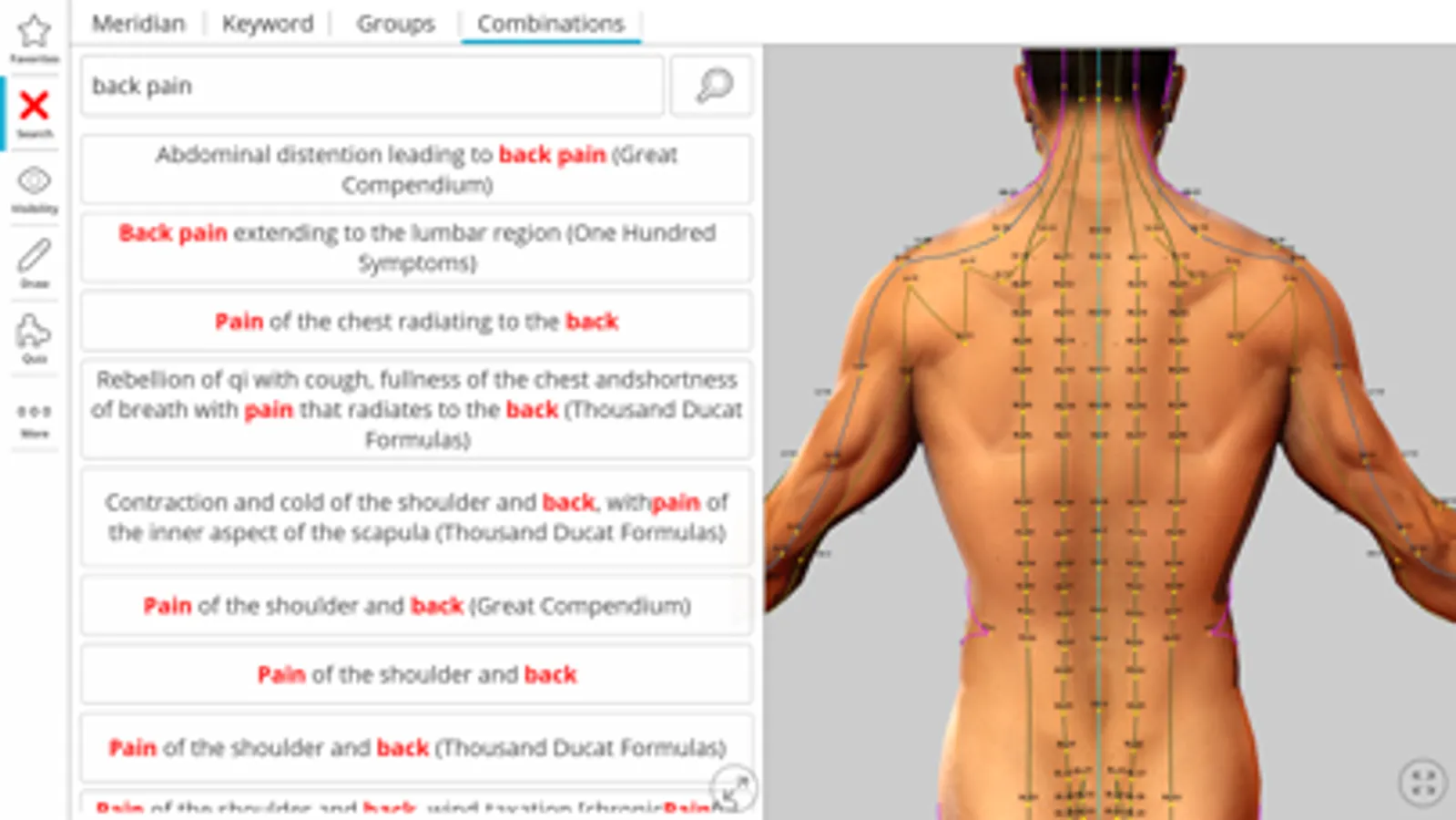 Contains extended searching options; search by acupuncture point name, by function or by indication.