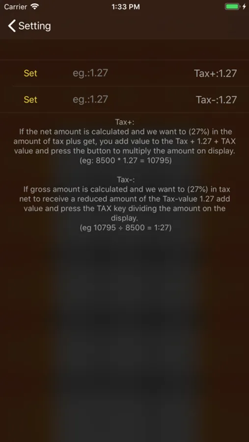•Tax-: If gross amount is calculated and we want to (27%) in tax net to receive a reduced amount of the Tax-value 1.27 add value and press the TAX key dividing the amount on the display. (eg 10795 ÷ 8500 = 1:27).