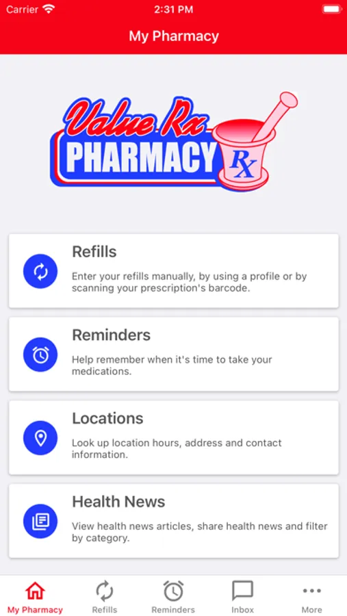 The Value Rx Pharmacy app allows you and your family to securely communicate with your local pharmacy. Refill your prescriptions with one click, get refill reminders, get discounts at your local pharmacy, get savings on brand drugs and access Pharmacist written pages that help you understand your condition or medications.