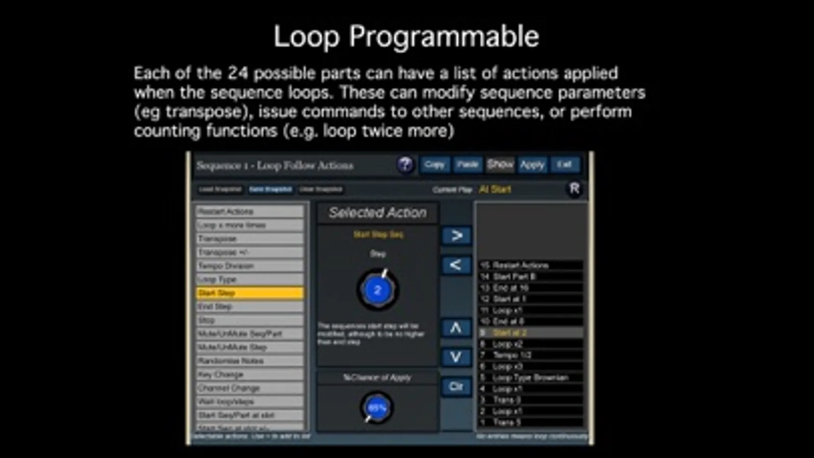 To aid you with faster control Quantum has loop actions which you can program in to carry out tasks when a sequence loops - e.g. transpose, randomise, start or load another sequence etc.