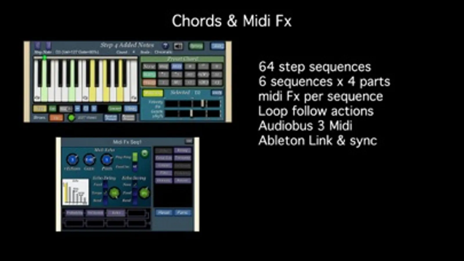 With up to 24 sequences playing Quantum introduces a mixer page allowing you to blend midi velocities. Built on the MidiSequencer engine, midi FX, devices & Controllers are now possible per sequence.