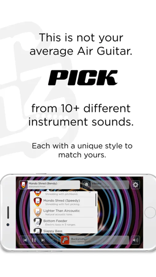 Trigger notes with a wireless motion-tracking pick and the app automatically chooses appropriate musical pitches based on a pre-analysis of the song. Explore your music library to find the best songs to play along with, the experience is unique for each song!