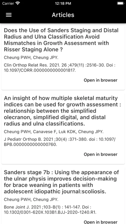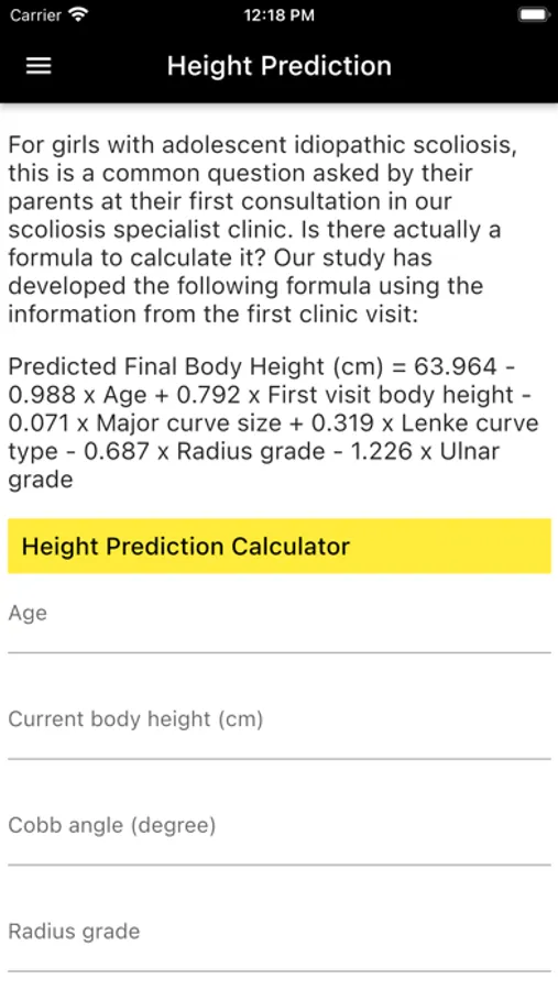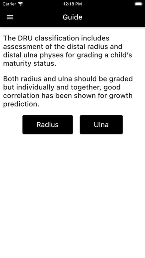 The distal radius and ulna (DRU) classification is an accurate parameter of a child’s maturity status. It is useful for management of spine and limb deformities as it can predict the peak growth spurt and growth cessation with good sensitivity and specificity. It has also been shown to be an indicator of scoliosis curve progression and predict which curves will deteriorate. This app provides users with a tool to understand the DRU classification, how to use the classification for grading skeletal maturity, and also for guiding treatment. In addition, this app has a calculation function for final body height prediction for female patients with idiopathic scoliosis.