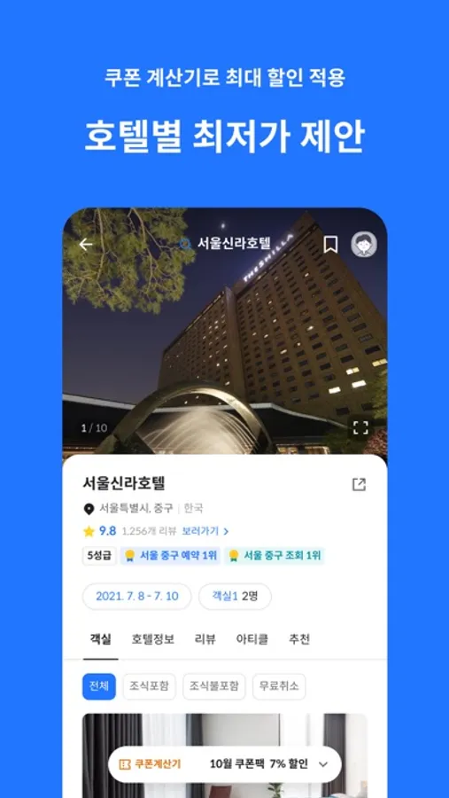 한눈에 정리된 호텔 정보 뿐아니라 쿠폰 계산기 기능으로 최대 할인 쿠폰이 자동으로 적용돼요.