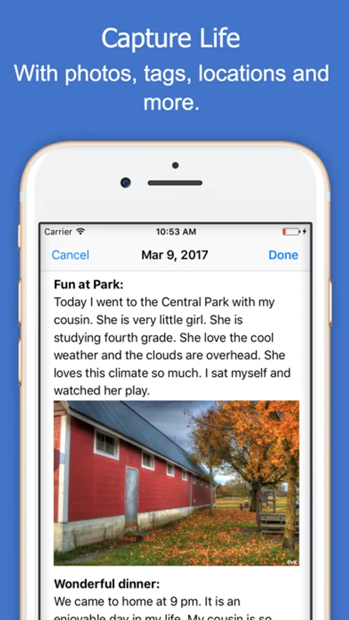 Reminisce Journal helps you to capture life moments, daily activities, thoughts, ideas and travel logs.