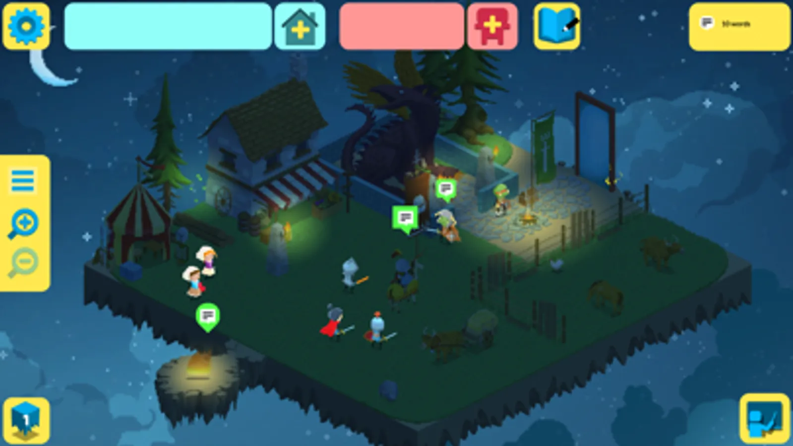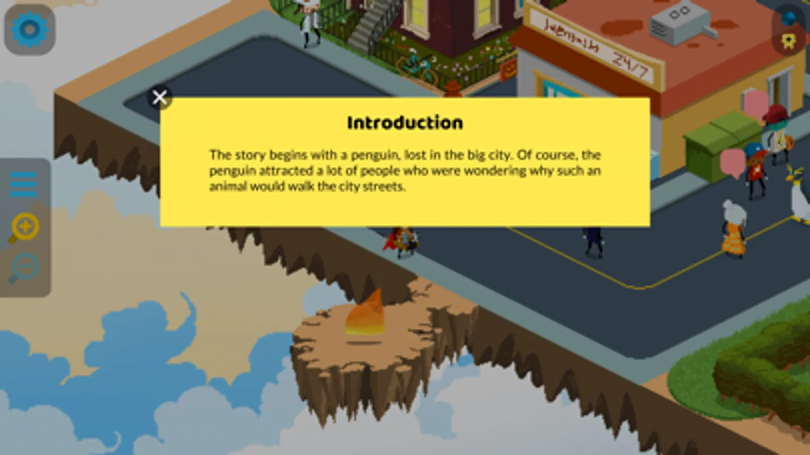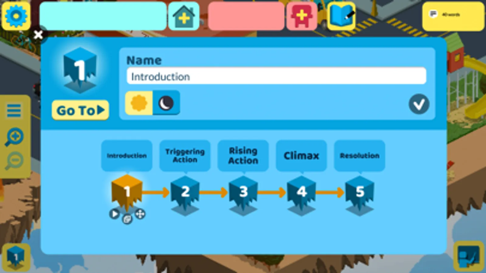 The game is principally designed to be used in class. The teacher manages the game through a website where they will create accounts for their students to login to the game. There they will also be able to create challenges, which the students will use to guide their creations in the game. Once they’ve been assigned a challenge, the students will use their imagination to create stories; placing buildings, objects and people on their worlds and annotating them with dialogues, descriptions, and other text. The website allows the teacher to correct the text that their student’s have written, and when the students have finished their work, the teacher can share a student’s work with the rest of the class.