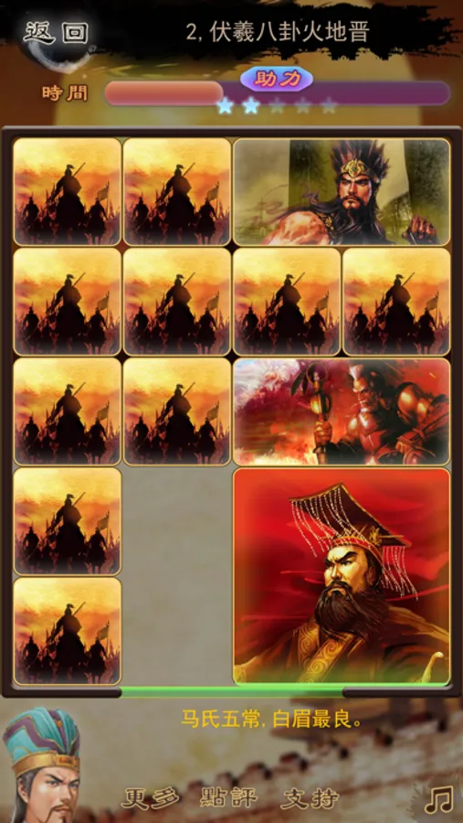 Rescue heroes,Cao Cao! you need to save Cao Cao,as you probably know history story of huarong,in this game,you need to move the largest square block of Cao Cao to the exit,a simple casual game player by sliding a game box,and get the biggest squares in the game,this is not so simple,is surrounded by other enemies in the game.