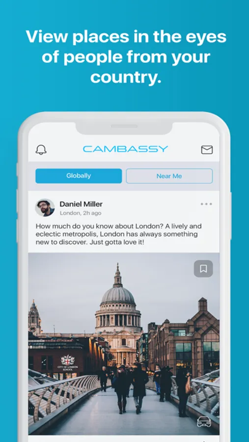 Cambassy is a social travel app that allows you to view places in the eyes of people from your country (Cambassadors), helping you to view a unique content.