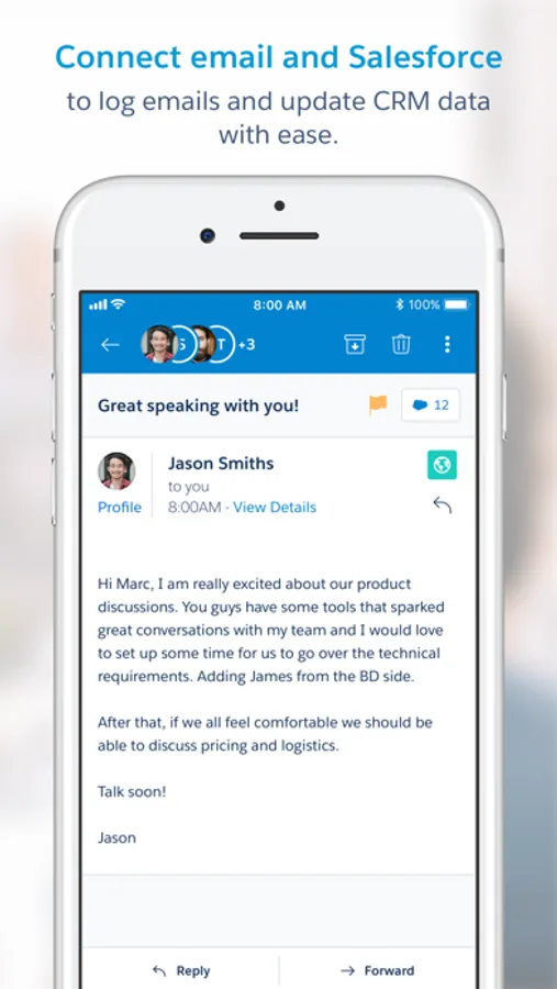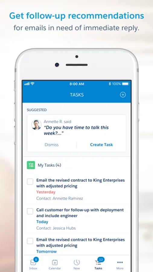 Salesforce Inbox brings email, calendar, and the world’s #1 CRM together in one app. Powered by Einstein, Inbox uses artificial intelligence to help sales reps sell smarter. The app provides focused context for today’s events and recommends follow-up actions so important opportunities never slip through the cracks. It automates time-consuming administrative tasks to increase sales productivity and let sales reps focus on what they do best - closing the deal. Arming users with seamless access to key insights and powerful Salesforce data, critical customer conversations are more meaningful and productive than ever before.