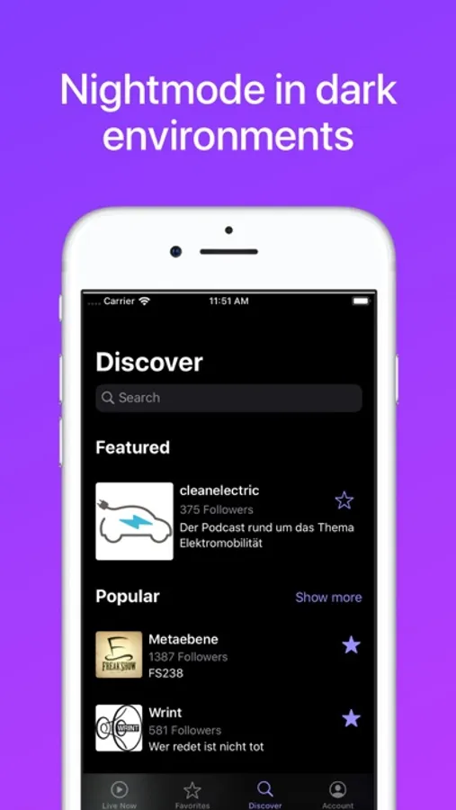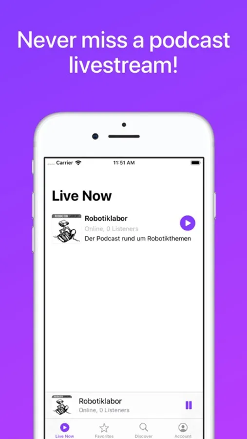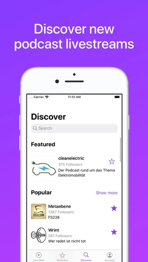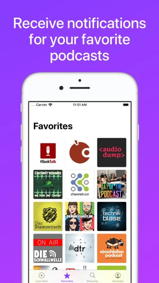Mark podcasts as favorites and receive push notifications as soon as a live stream starts. You'll never miss a show again!