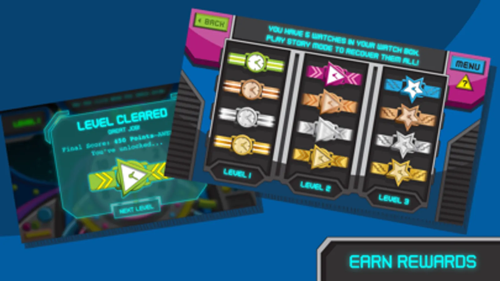Game Mode LEVEL 3: Rocket Time - Time, in the form of clock faces, is falling from the top of the screen toward the player’s Time Machine. The player must tap the clock that matches the written time shown at the bottom of their screen.