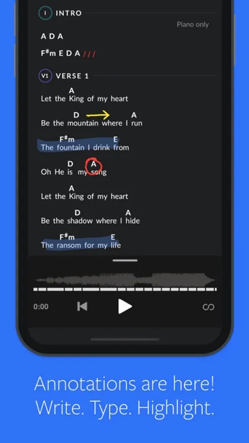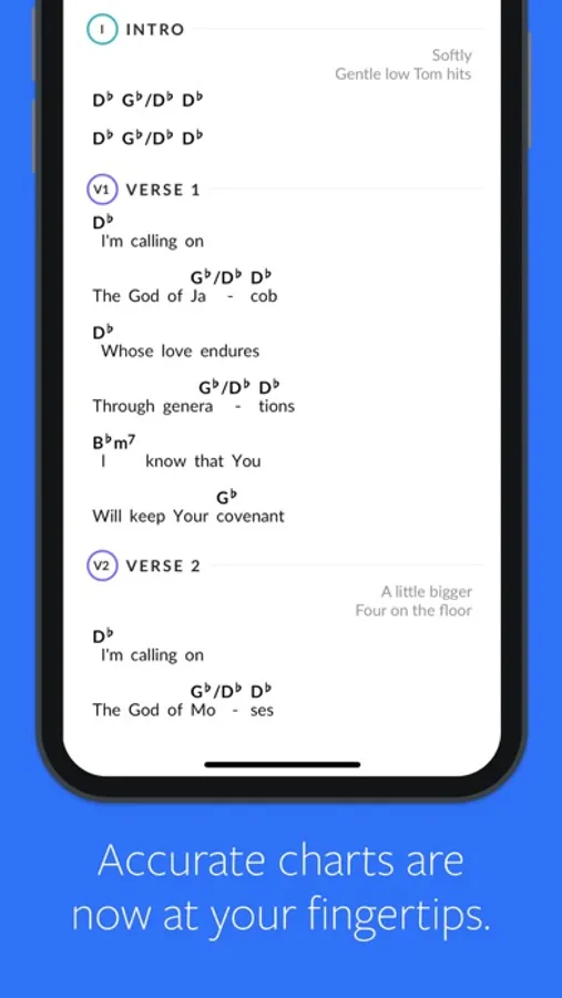 ChartBuilder® allows you to endlessly customize each chart to meet your needs. Change the Key, Capo, Chord Display, & Layout with filters. Write, type, & highlight in any song section on your charts with Annotations. Easily save & recall them at any time. Lead with confidence.