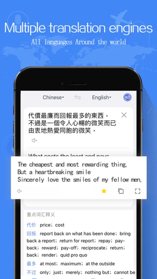 Can provide you with a variety of translation results comparison and reference, and the integration of advanced speech recognition technology and picture recognition technology, can effectively improve your translation efficiency, is your work, life, study, travel and other necessary translation artifact.