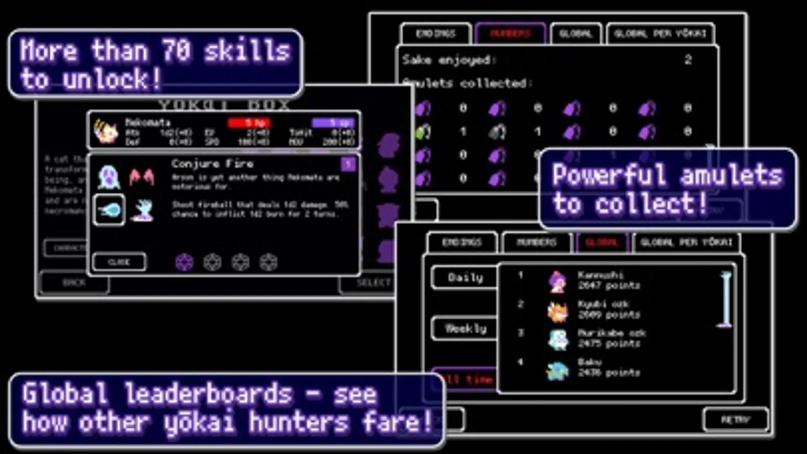 Your phone gets the ability to summon and trap yōkai - numerous spirits that have been living hidden among us (until now). Admire them and give them witty nicknames and then put them in the brutal ever-changing dungeon to try and summon even more yōkai! Spooky cute graphics and powders made from various body parts included.