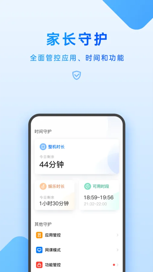 3.应用管控:可管控孩子下载应用、已安装应用是否允许使用、娱乐应用时长时间。
