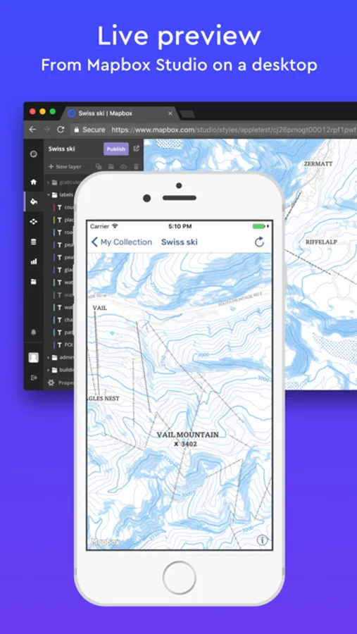 Design beautiful custom maps using Mapbox Studio on your desktop (studio.mapbox.com), then take your maps with you with Studio Preview. Prototype maps and data visualizations in Studio on the web and get a live preview on mobile.