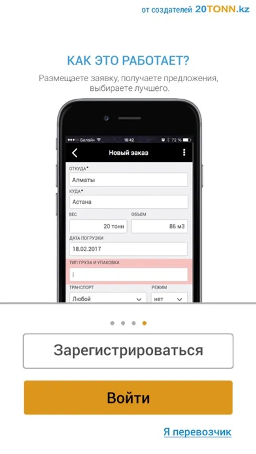 20tonn.kz для заказчиков позволяет размещать заявки на грузоперевозки, моментально получать предложения по перевозке груза и выбирать самый выгодный вариант доставки вашего груза. Получайте предложения от прямых водителей и лучших транспортных компаний, таких как Post Express, ABT E-Trans, Алем-ТАТ, SGM, Glotus Limited, КАЗРЕФ, LargoTrack, ЛАУРА плюс и других по доставке груза.