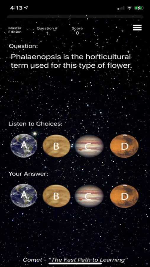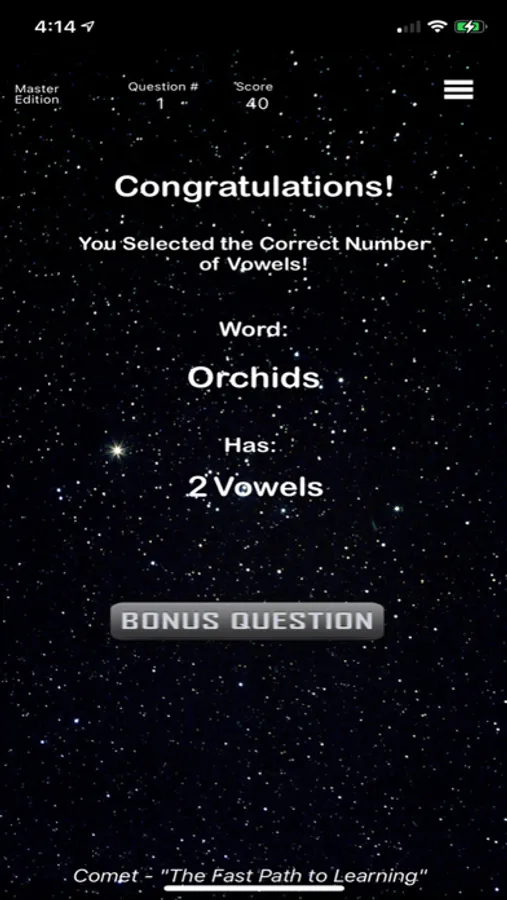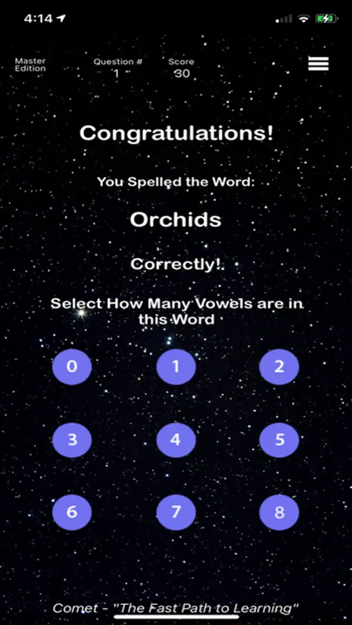 Comet The Spelling Game is the Fast Path to Learning! The Master Edition has over 450 questions for everyone to enjoy. Gain knowledge in an entertaining way that will amaze you. Never under estimate your spelling!
