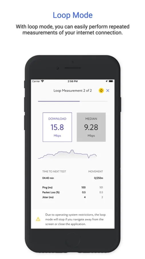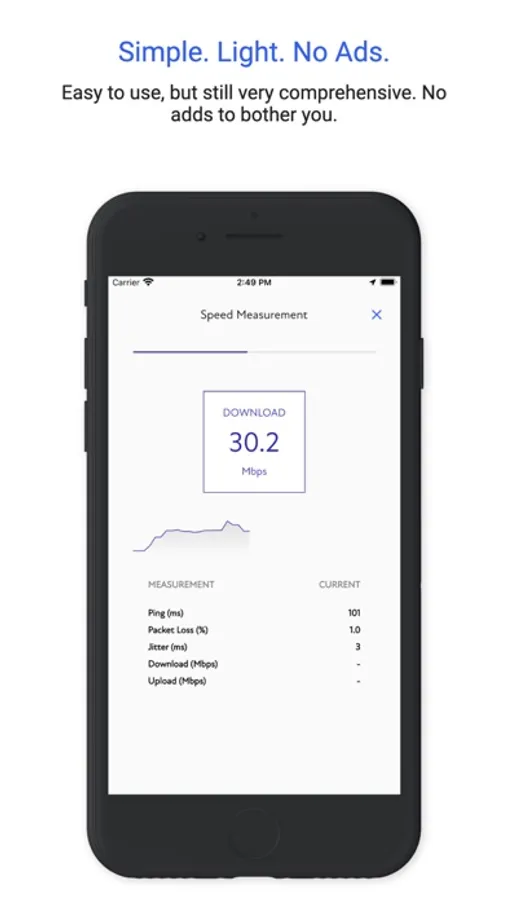 Nettfart Mobile provides:Test of download speed, upload speed, packet loss, jitter and delay (ping).