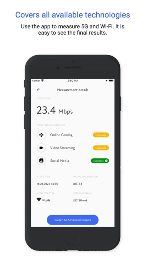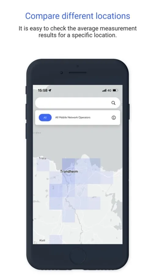 • A map view containing test results for people using the app to measure their mobile subscription. Here you can filter to see e.g. where your operator has enabled 5G, or compare different operators.