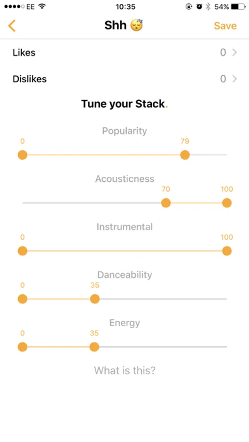 Furthermore, you are able to 'tune' any of your Stacks (by their 'acousticness', 'danceability' etc.) in order to have even more control over what kind of songs you encounter.