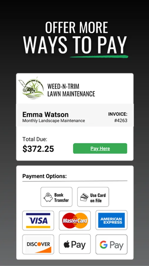 • Get paid faster with online and in-app payment processing (can be passed to customers as a service fee)