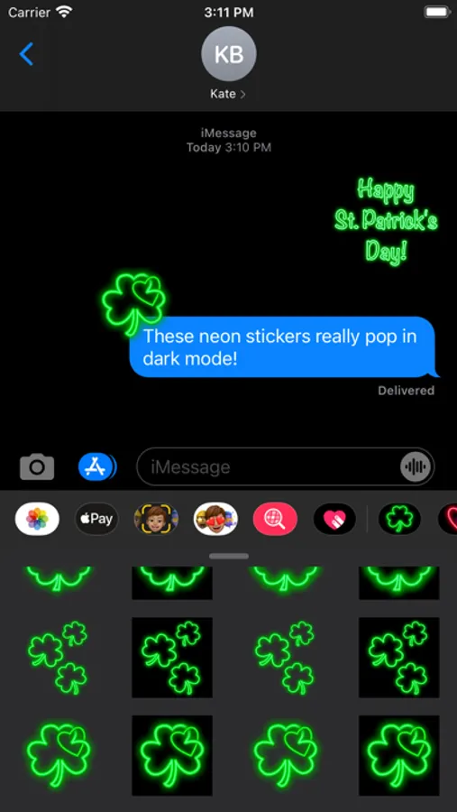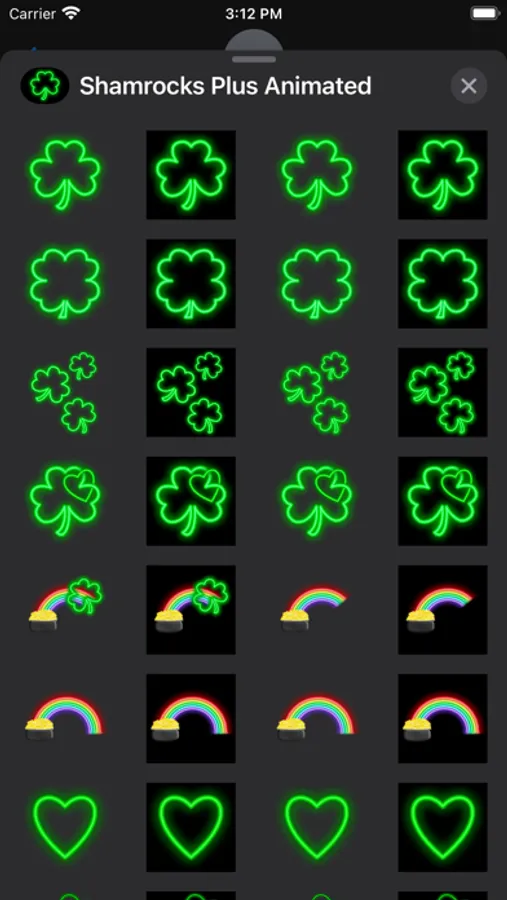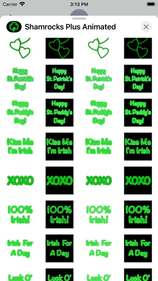 This animated sticker pack for iMessage includes neon shamrocks, green hearts, rainbows, St. Patrick's Day wishes and more. The neon colors take full advantage of the wide gamut display on the latest devices and look fantastic in dark mode.