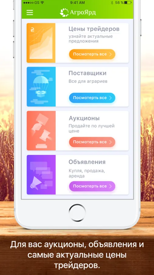 Мобильное приложение АгроЯрд разработано специально для аграриев. С помощью АгроЯрд в режиме online вы можете легко и удобно управлять своим бизнесом и совершать сделки из любой точки Украины. Вам больше не надо пользоваться различными площадками и тратить лишнее время на нецелевое общение. Регистрация в сервисе АгроЯрд даст вам возможность быстро и оперативно продавать или покупать урожай, участвовать в тендерах, создавать аукционы и покупать все необходимое для аграрной деятельности.