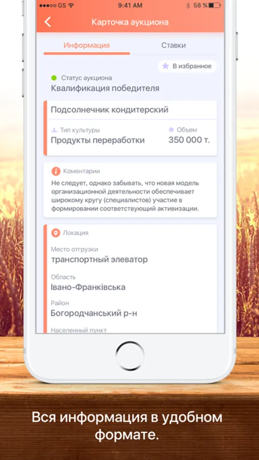Аукционы – здесь аграрий может создавать зерновые аукционы, принимать участие в уже созданных и добавить понравившийся вариант в избранное.
