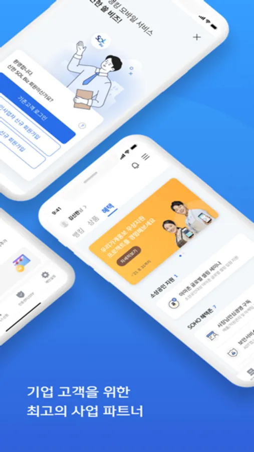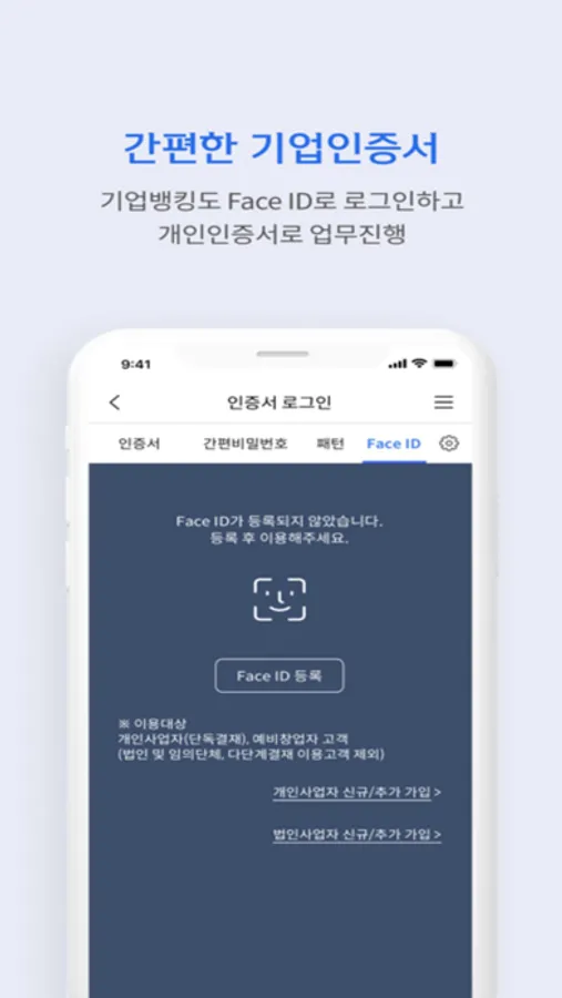 - 간편로그인: SOHO고객이 기업인증서 없이도 PIN번호, 패턴, 지문 등 간편한 방법으로 로그인 가능