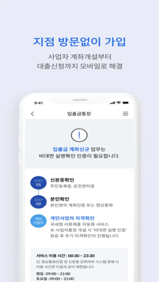 - 비대면 회원가입: 개인사업자 고객 대상 비대면 실명확인 프로세스를 통하여 은행 방문 없이
