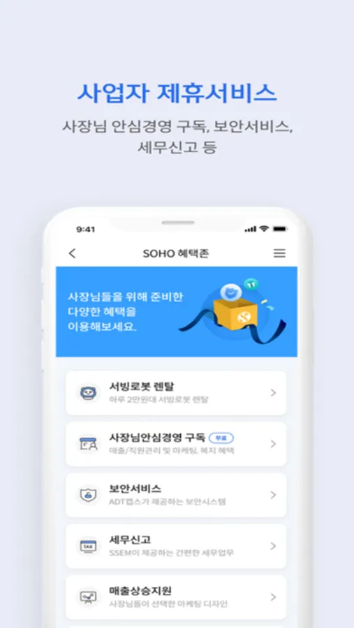 - SOHO서비스: 비즈니스 파트너, 세무지원, 쇼핑몰 서비스 등 다양한 비금융 서비스와 제휴하여 SOHO고객의 경영편의성 제공
