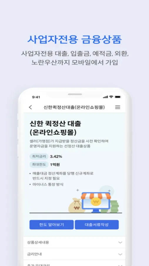 - 비대면 서비스 신청(개인사업자): 쏠비즈(SOL Biz) 설치 후 본인인증 및 비대면실명확인 프로세스 진행하여 가입 및 계좌개설 가능