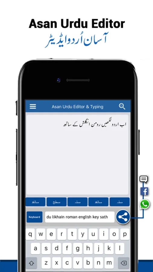 Asan Urdu Editor is the best app for typing and sharing notes in Urdu. The best thing about this Urdu Toying Editor is that it automatically converts roman English in to Urdu by picking the accurate words.
