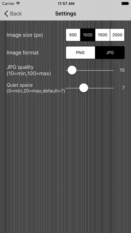With Settings screen, you can choose image size, format, quality, and quiet space level !