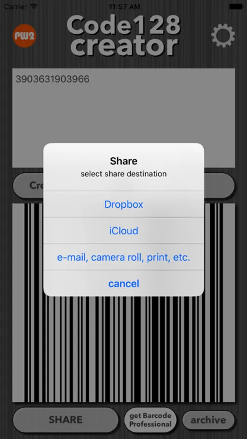 You can build barcode and share it with Dropbox, iCloud, email, print, and any other apps that support sharing (WhatsApp, Facebook, Twitter, Telegram....)