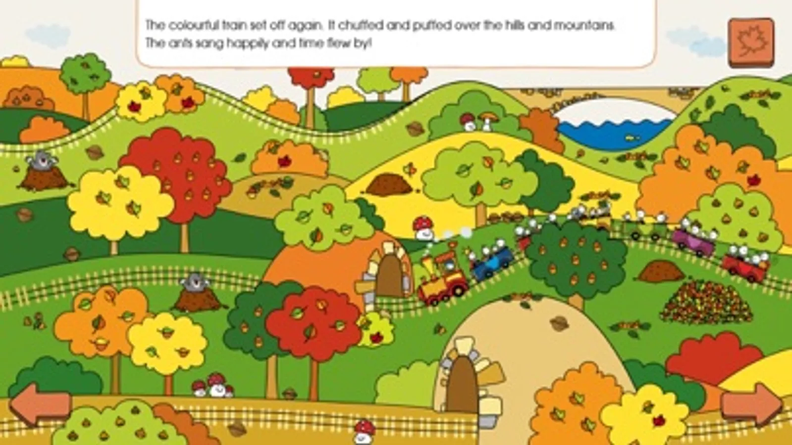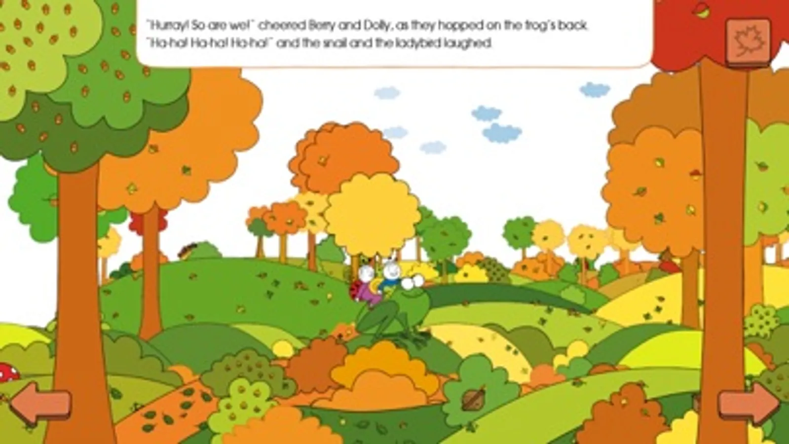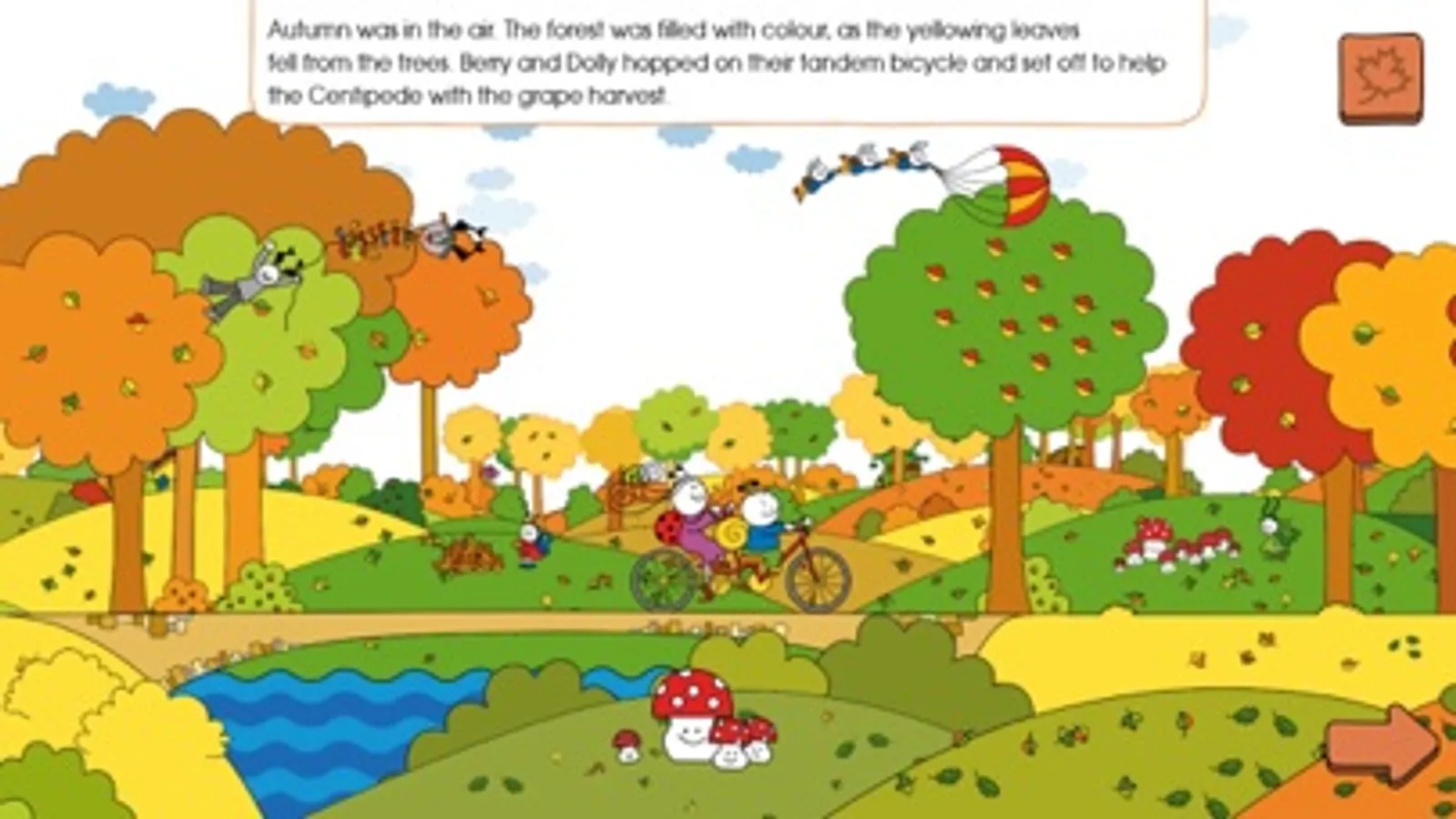 The Berry and Dolly tales features Dolly, the ladybird girl, and Berry, the snail boy. In the application made from the Autumn Tale of the Four Seasons Book, the Centipede is the host. Berry and Dolly are on their way to his house to help him harvesting grapes, however their tandem bike receives a nasty puncture. How will the little friends continue their journey?