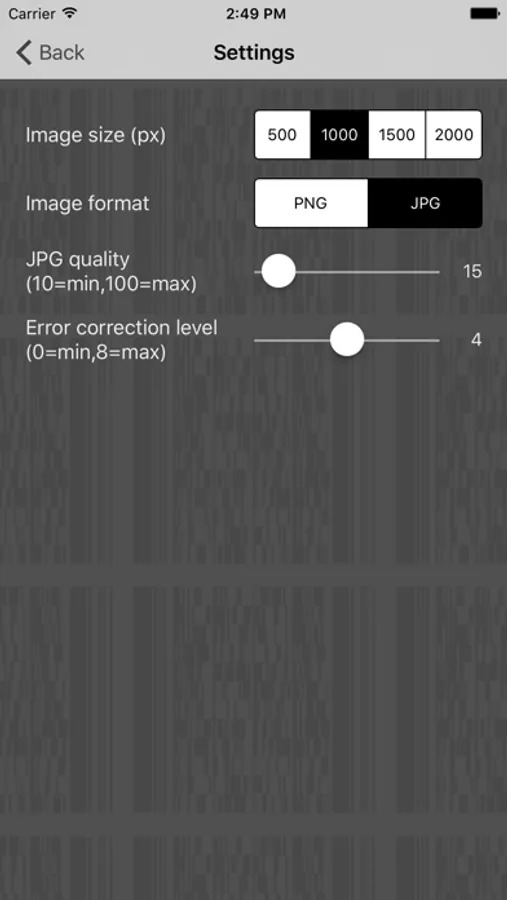 With Settings screen, you can choose image size, format, quality, and error correction level !
