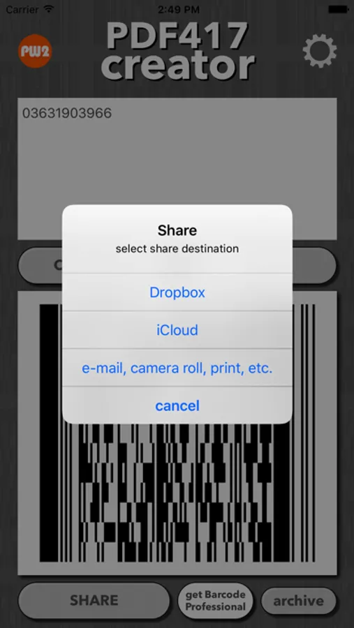 You can build barcode and share it with Dropbox, iCloud, email, print, and any other apps that support sharing (WhatsApp, Facebook, Twitter, Telegram....)