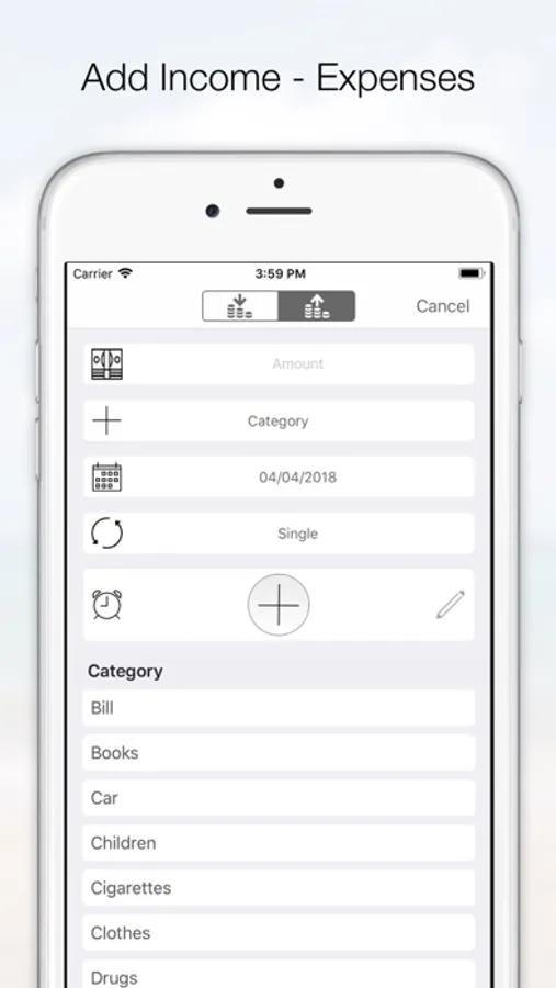 - Add expenses or income, single or recurrent, divided by category, add a note or new categories if necessary.