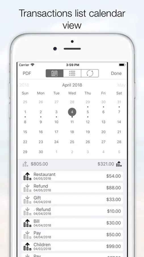 - Display a list of all the movements, or in calendar mode, divided by month or week, with totals.