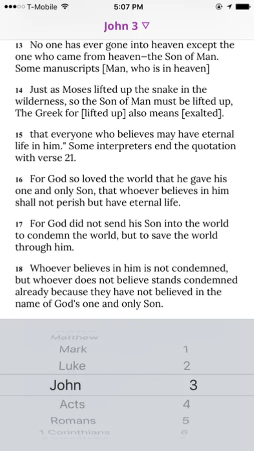 This bible app strives for simplicity. All navigation is easy to find and accessible at the top of the screen and at the end of chapter, so you can quickly move around. It doesn't have any complicated features, and it doesn't send you push notifications. This app is for those who enjoy the pure, simple joy of reading the bible, unencumbered.