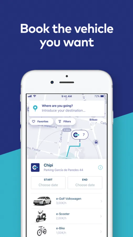 - Find carsharing, motosharing, bikes or scooters that are closest to you and book it.