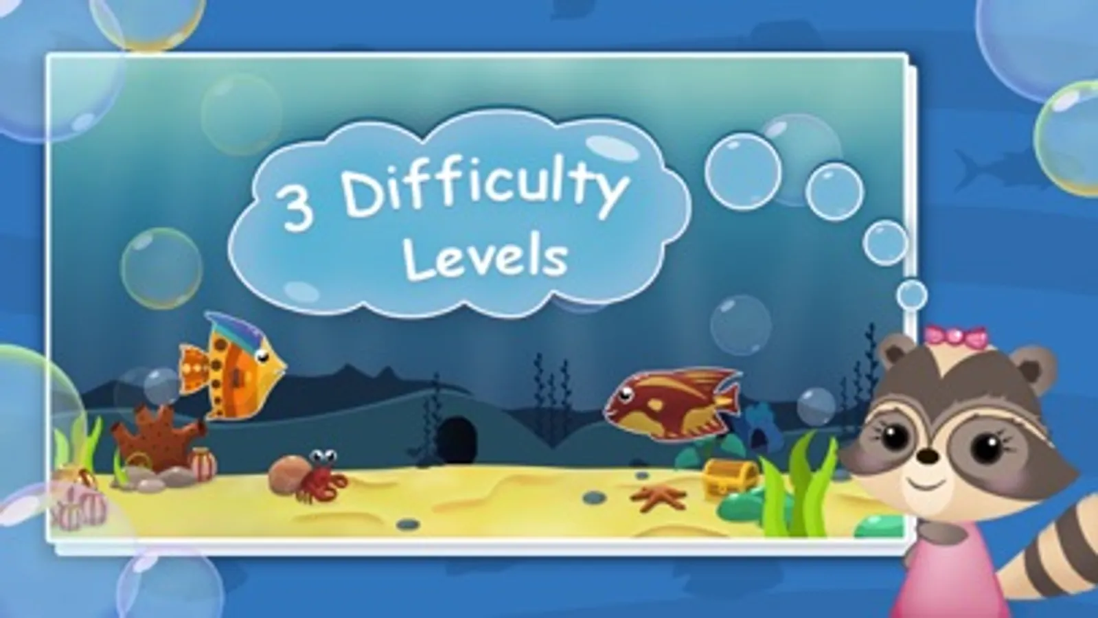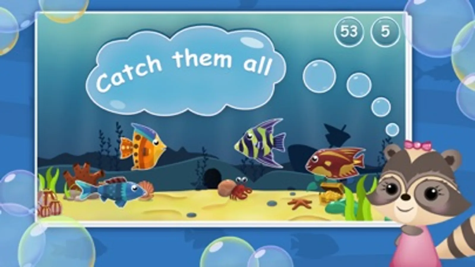 - Puzzle - we show your child a fish picture. Help Candy Raccoon to catch the right one! If wrong fish is chosen, it makes a funny sound.