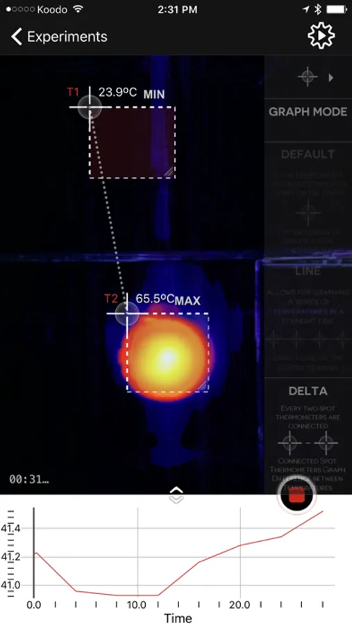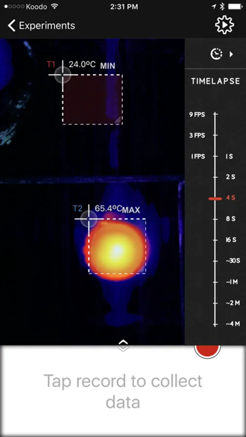 Mark up to four locations or regions on a thermal image. In a selected region, you can determine minimum, maximum or average temperature. Graph temperature data live during an experiment, then export to our Graphical Analysis app for further analysis. Thermal image videos can also be exported to the Photos app. Videos can be captured in real-time or time-lapse.
